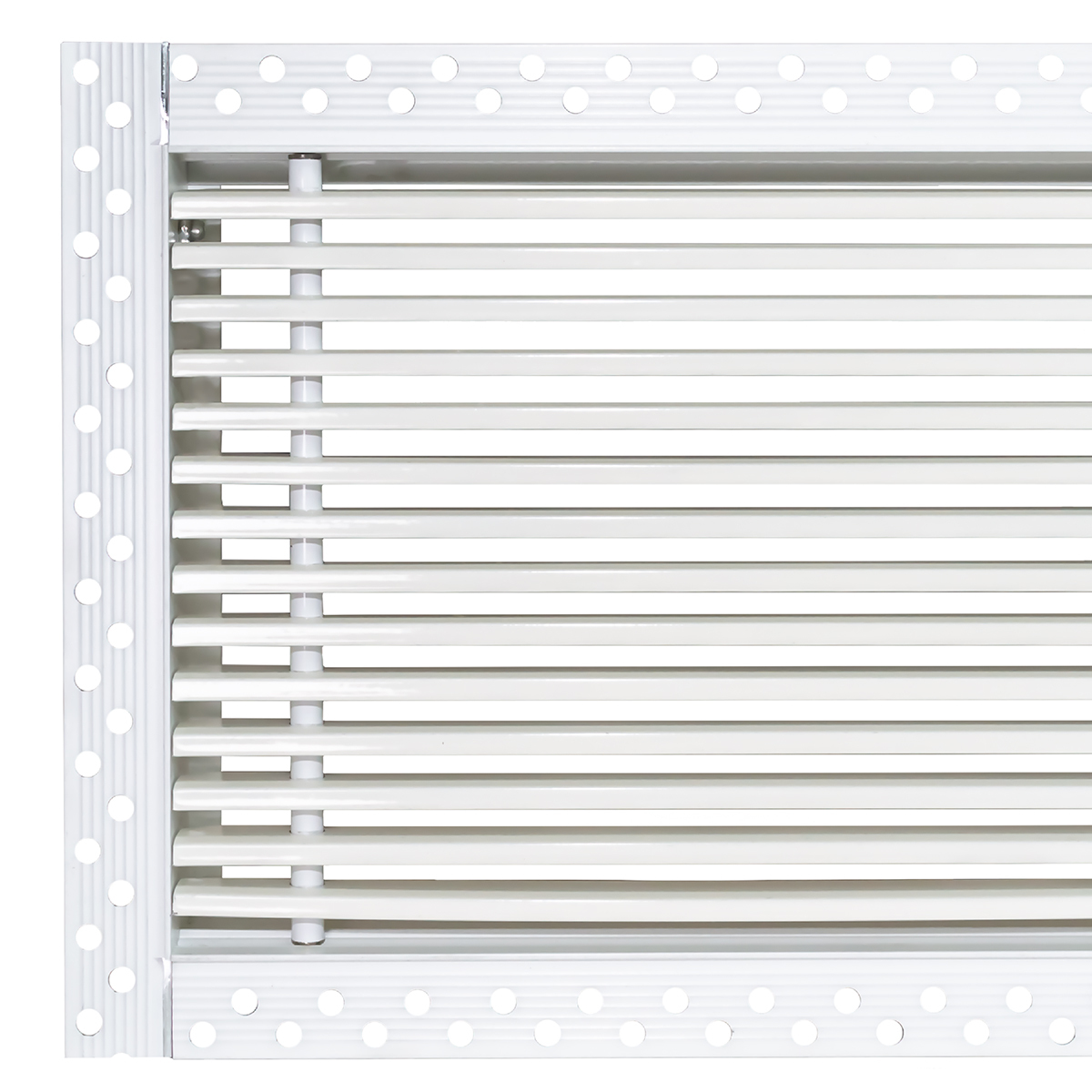 Данная решетка подходит для монтажа на любую поверхность под финишную отделку. Рамка и экран изготовлены из алюминия, опора экрана - из оцинкованной стали. Рама оснащена «полкой» 1,9 мм и рифлеными краями для большей адгезии финишного материала – шпатлевки, цемента. Решетка имеет съемную центральную часть с фиксированным углом наклона ламелей 15°. Она крепится к корпусу прочными металлическими тросиками, легко снимается для очистки и удобного обслуживания.